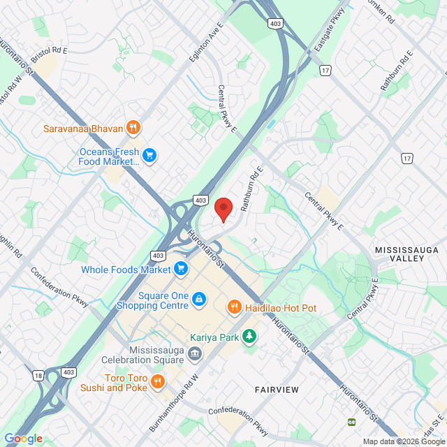 Enter through the glass doors. Parking is free. Close to Square One parking.